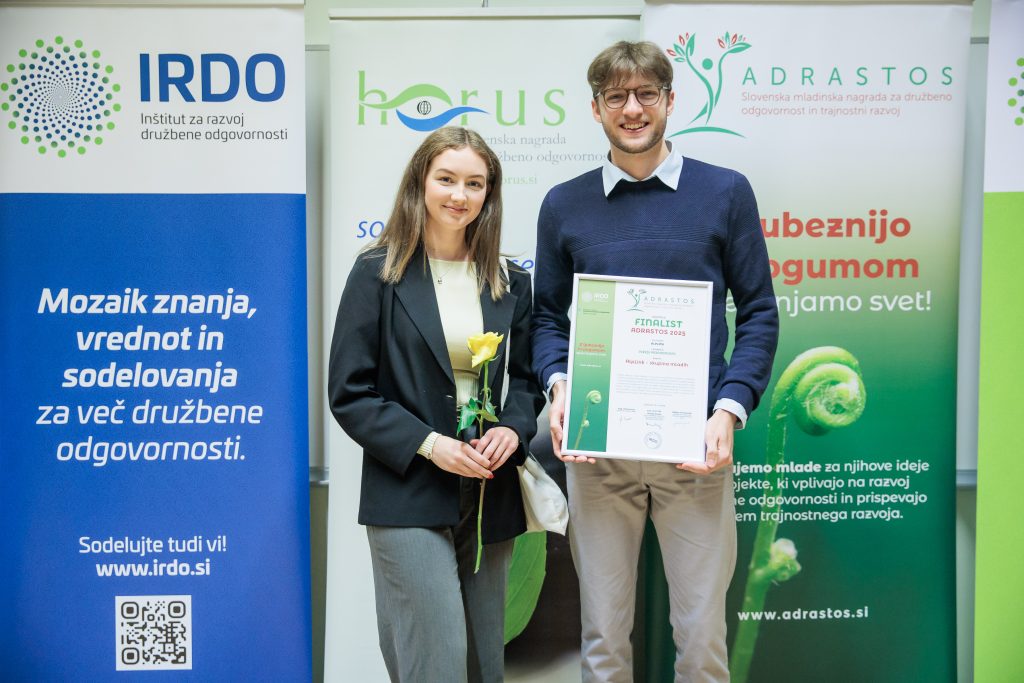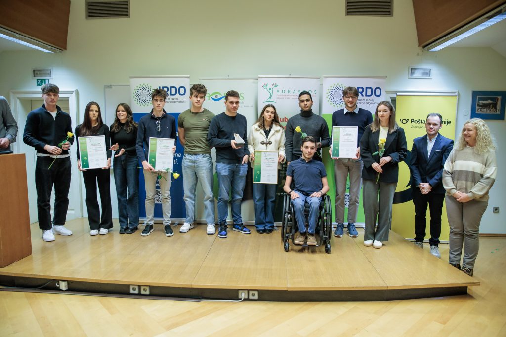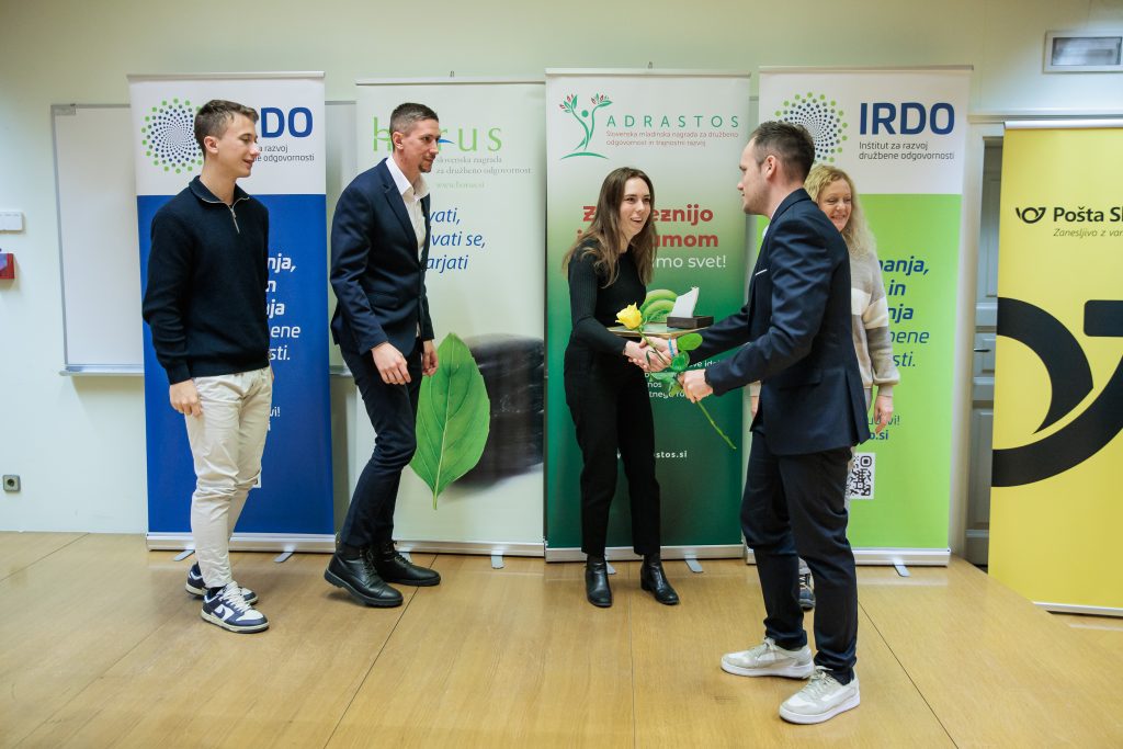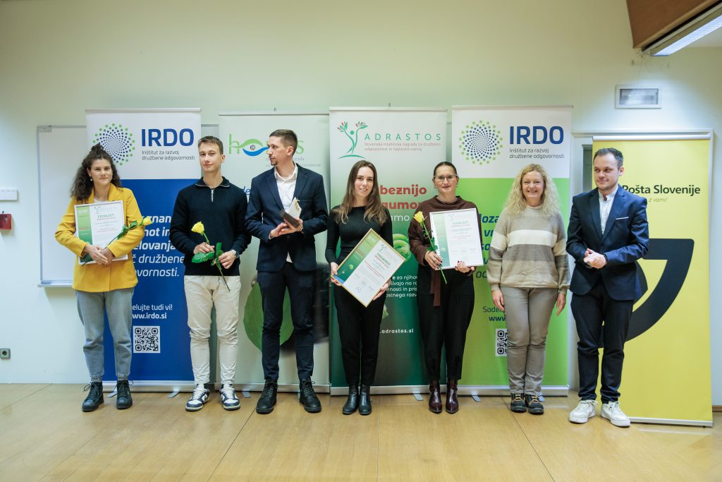 (Ljubljana, 16. december 2025) Danes je IRDO – Inštitut za razvoj družbene odgovornosti v prostorih Pošta Slovenije d.o.o. v Ljubljani 14 izjemnim organizacijam in posameznikom podelil nagrade in priznanja za družbeno odgovornost in trajnostni razvoj HORUS  2025. Prav tako pa 8 izjemnim projektom mladih in za mlade v okviru ADRASTOS 2025 – Slovenske mladinske nagrade za družbeno odgovornost in trajnostni razvoj. Nagrada ADRASTOS je bila letos podeljena tretjič, nagrada HORUS pa sedemnajstič zapored. Častna pokroviteljica podelitve obeh nagrad je mag. Tina Kosi, direktorica Urada RS za mladino.